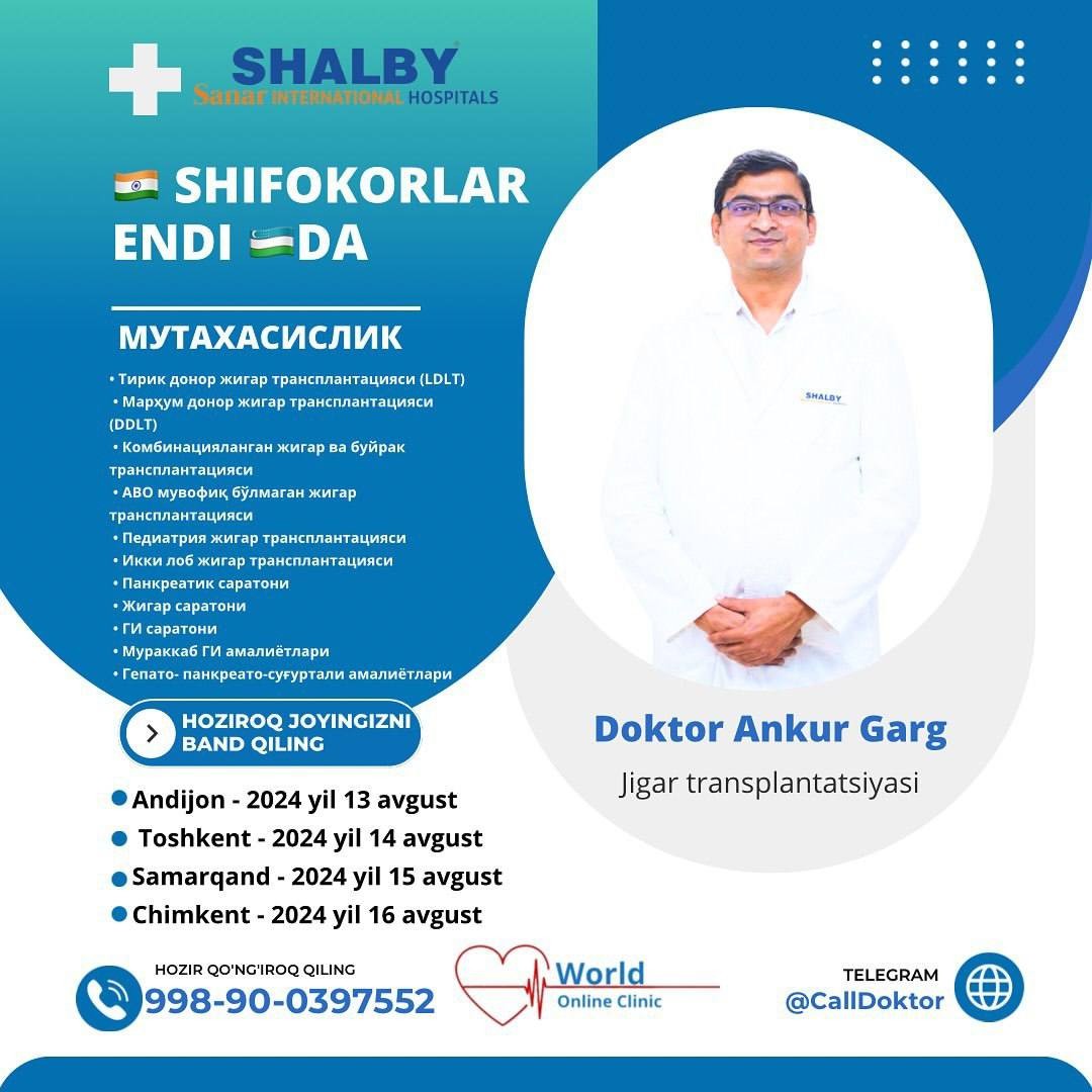 Ўзбекистон-Ҳиндистон  орасида тузилган меморандум асосида 2024 йил 14 август куни Республика ихтисослаштирилган эпидемиология,микробиология,юқумли ва паразитар касалликлар илмий амалий тиббиёт марказига  Санар Халқаро Шифохонаси мутахассислари Др Анкур Гарг ва Др Арчит Пандит ташриф буюришади. Кўриклар бепул ўтказилади.